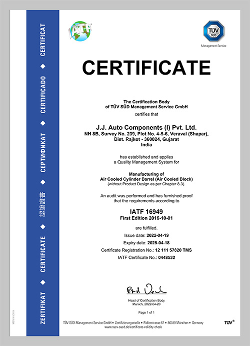 Additionally, we apply SPC (Statistical Process Control) to monitor production parameters and maintain consistent quality. Non-conforming parts are identified and corrected immediately, reducing defects and wastage. Our facility is certified under ISO TS 16949 demonstrating our commitment to maintaining a robust Quality Management System.